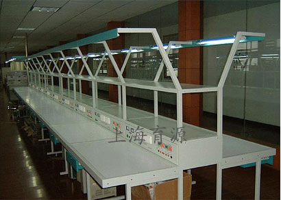 实训台上提供日光灯(用于照明)2个,透明的PVC板4个,可夹放原理图等资料,另外还配备三芯双联暗插座4个、两芯暗插座2个、工具柜2个,工作台面设有绿色防静电桌垫,整个装配线安全可靠。